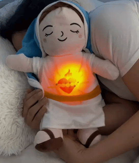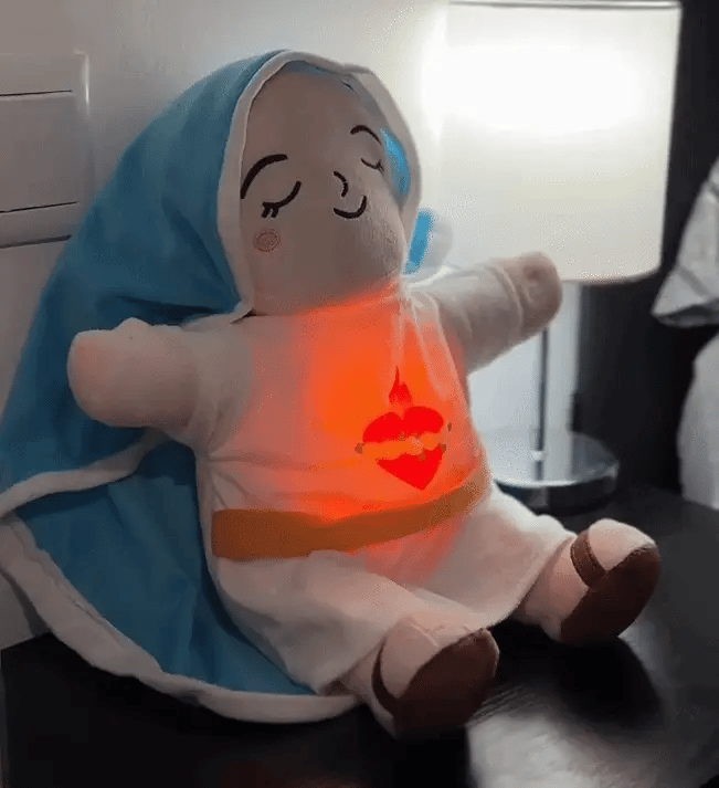 El Peluche Respiro de Fe™ destaca por su mecanismo interno que simula un ritmo de respiración real y calmante. Cuenta con una luz tenue y suave en el pecho, y emite melodías tranquilizadoras (incluyendo el sonido de respiración) diseñadas específicamente para reducir la ansiedad, calmar la mente y acompañarte en tus momentos de oración o descanso.